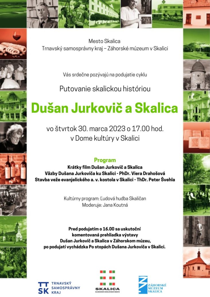 Mesto Skalica spolu so Záhorským múzeom v Skalici pozývajú na ďalší diel cyklu Putovanie skalickou históriou, tentoraz zameraný na osobnosť architekta Dušana Jurkoviča a jeho vzťah k mestu Skalica. Pred podujatím o 16.00 sa uskutoční komentovaná prehliadka výstavy Dušan Jurkovič a Skalica v Záhorskom múzeu. V rámci hlavného programu bude premietaný krátky film Dušan Jurkovič a Skalica a odznejú príspevky PhDr. Viery Drahošovej Väzby Dušana Jurkoviča ku Skalici a ThDr. Petra Švehlu Stavba veže evanjelického a. v. kostola v Skalici.