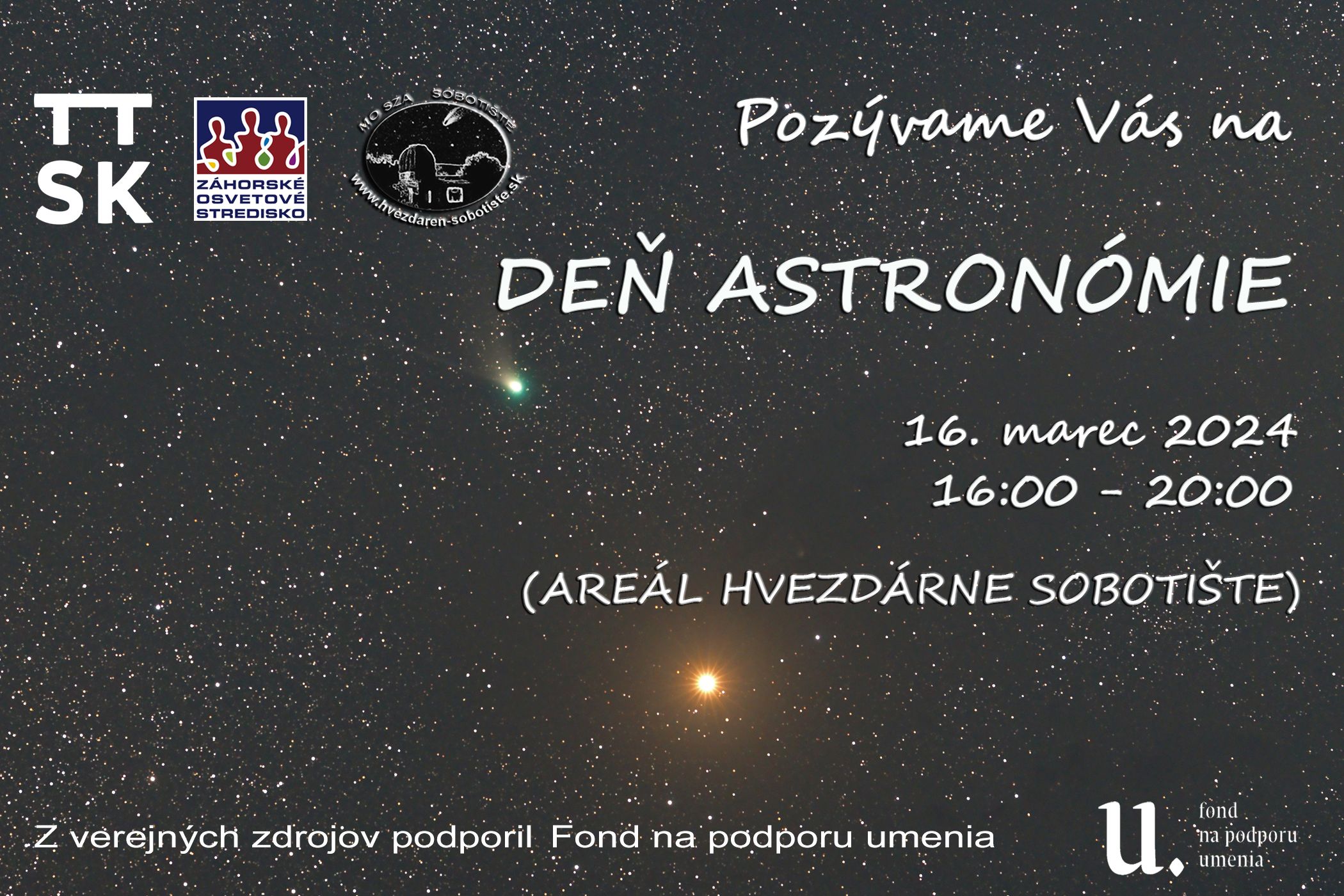 Trnavský samosprávny kraj – Záhorské osvetové stredisko v Senici a Miestna organizácia Slovenského zväzu astronómov v Sobotišti Vás pri príležitosti Dňa astronómie 2024 srdečne pozývajú na astronomické popoludnie, ktoré sa uskutoční v sobotu 16. marca 2024 od 16:00 do 20:00 hodiny v areáli Hvezdárne v Sobotišti.