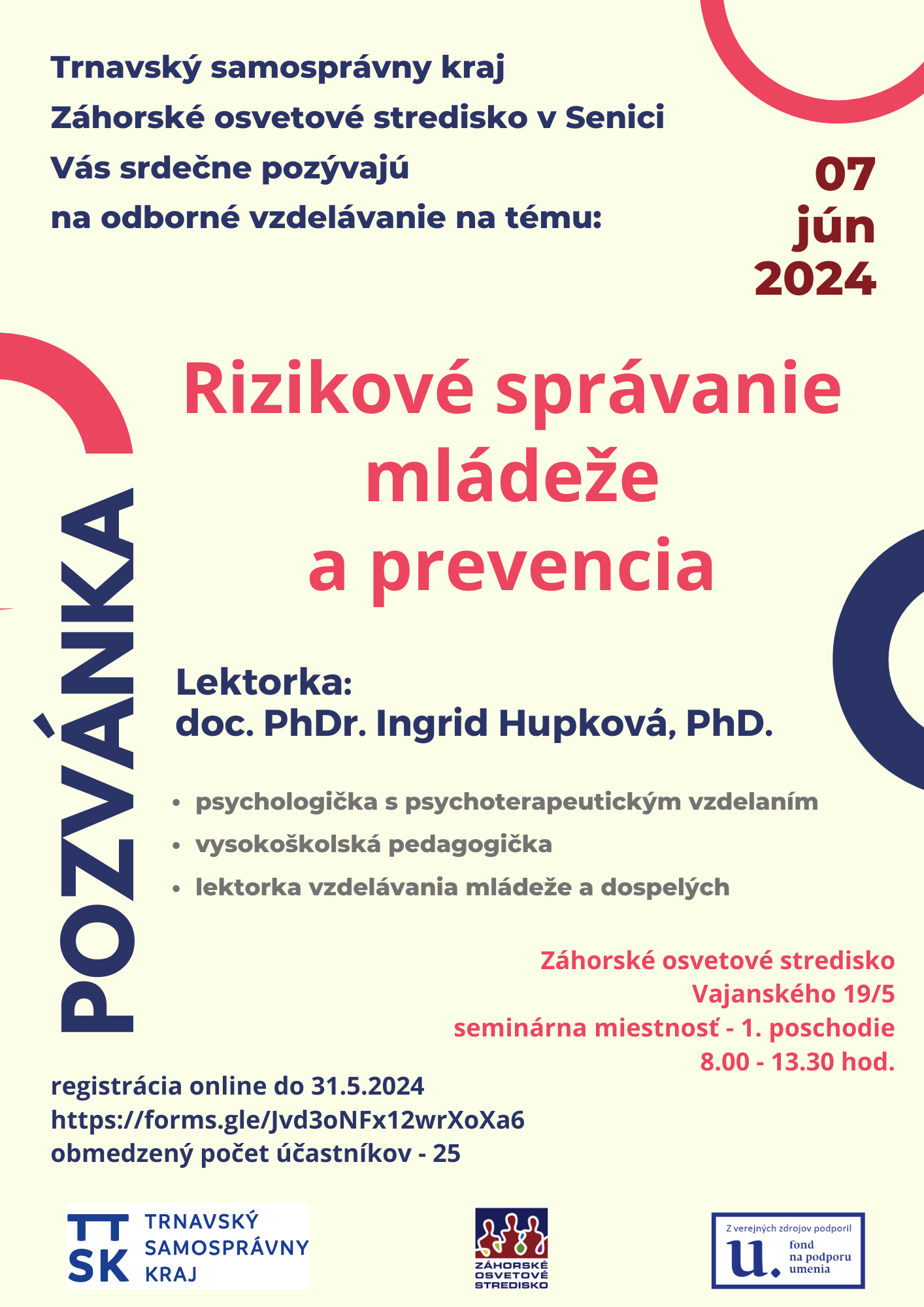 Záhorské osvetové stredisko v Senici pre Vás pripravilo odborné vzdelávanie na tému – Rizikové správanie mládeže a prevencia.