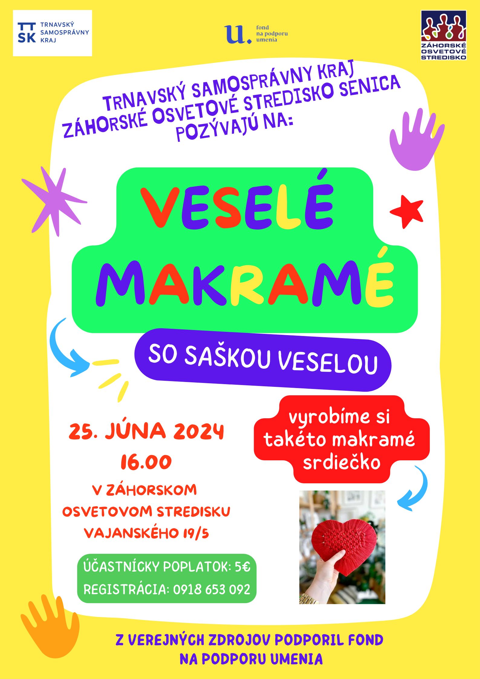 Srdečne vás pozývame na tvorivú dielňu Veselé makramé, ktorá sa uskutoční v utorok 25. 6. 2024 v priestoroch Záhorského osvetového strediska. Počet miest je obmedzený, v prípade záujmu si zarezervujte miesto na tel. čísle 0918 653 092. Tešíme sa na spoločné tvorenie!