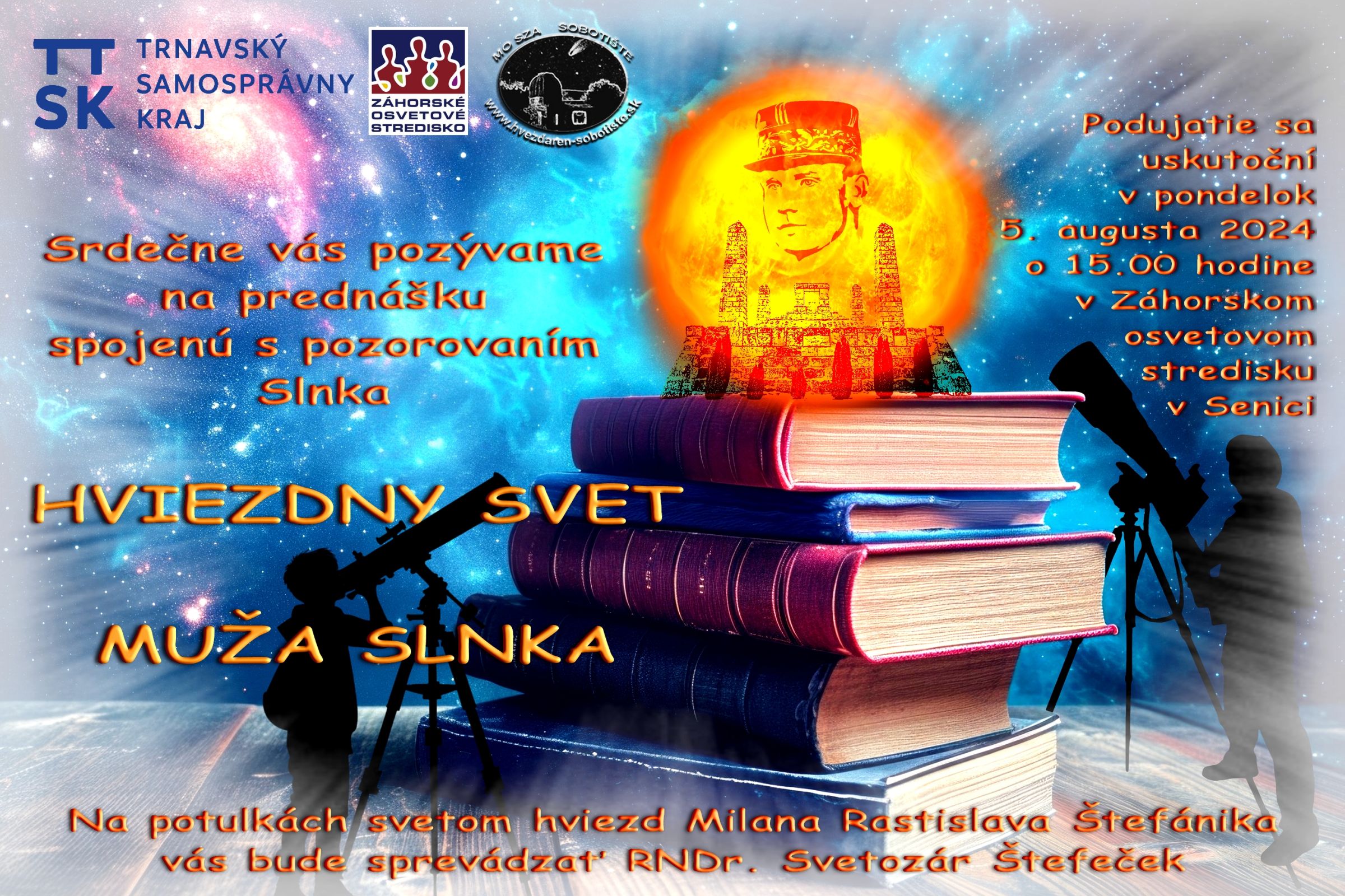 Trnavský samosprávny kraj – Záhorské osvetové stredisko v Senici a Miestna organizácia Slovenského zväzu astronómov v Sobotišti Vás pri príležitosti nedávneho výročia narodenia velikána našich novodobých dejín, generála Milana Rastislava Štefánika, srdečne pozývajú na tematickú astronomickú prednášku s názvom „Hviezdny svet Muža Slnka“. Na potulkách svetom hviezd Milana Rastislava Štefánika ako zanieteného astronóma Vás bude sprevádzať RNDr. Svetozár Štefeček. Súčasťou tohto podujatia bude aj verejné pozorovanie Slnka.
