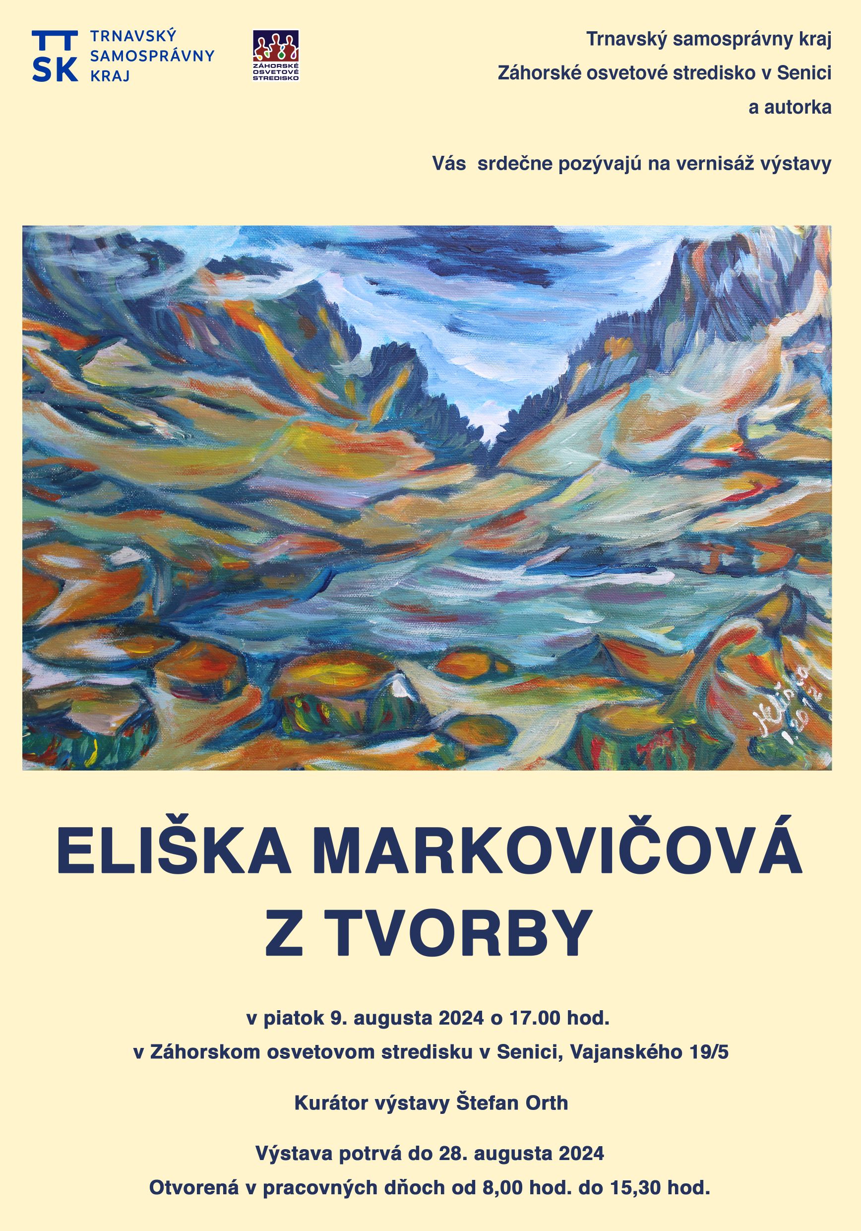 Eliška Markovičová sa doteraz zúčastňovala kolektívnych prezentácií diel. Navštevuje Štúdium pre dospelých v Základnej umeleckej škole v Senici u pedagóga a výtvarného umelca Štefana Ortha, ktorý je aj kurátorom jej prvej samostatnej výstavy. V kultúrnom programe sa počas vernisáže hrou na akordeón predstaví talentovaný hudobník Michal Čas, pedagóg ZUŠ v Senici. Výstavu si môžete pozrieť do 28. augusta 2024 v pracovných dňoch od 8,00 do 15,30 hodiny.