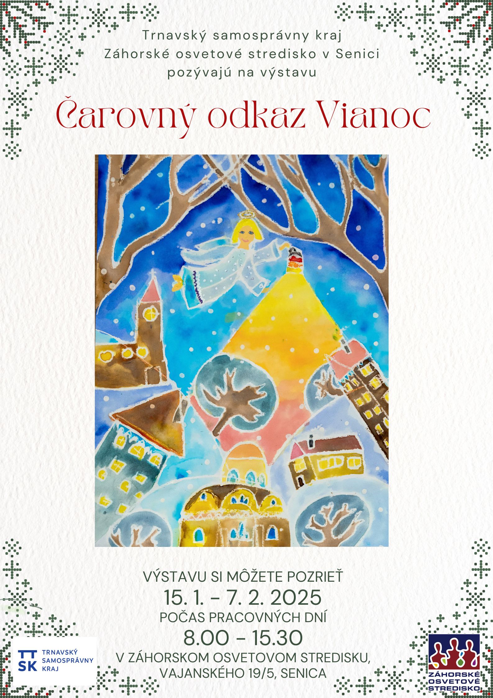 Srdečne pozývame na výstavu prác detskej výtvarnej a literárnej súťaže Čarovný odkaz Vianoc. Výstavu si môžete prísť pozrieť do Záhorského osvetového strediska od 15. 1. do 7. 2. 2025 počas pracovných dní v čase 8.00 – 15.30.