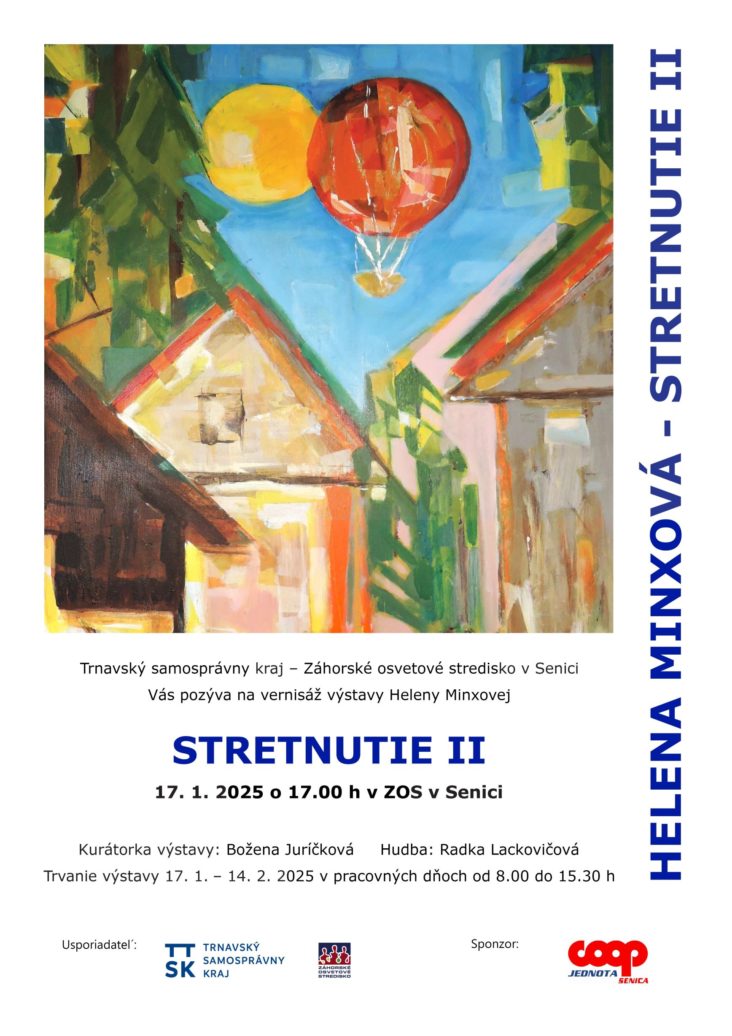 Vernisáž výstavy Helena Minxová – Stretnutie II sa uskutoční v piatok 17. januára 2025 o 17,00 hodine vo výstavnej sále Záhorského osvetového strediska v Senici. Kurátorkou výstavy je Božena Juríčková, v hudobnom programe sa hrou na gitaru predstaví Radka Lackovičová. Trnavský samosprávny kraj – Záhorské osvetové stredisko v Senici pripravili výstavu pri príležitosti životného jubilea autorky a pozrieť si ju môžete do 14. februára 2025. Vernisáž finančne podporila Coop Jednota, SD Senica.