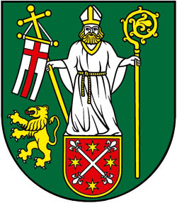 V zelenom štíte na červenom zlatolemom štíte so znamením strieborného ondrejského ľaliovitého kríža, sprevádzaného štyrmi zlatými hviezdami, stojaci zlatobradý biskup v striebornom, zlato prepásanom rúchu a striebornej, zlatom zdobenej mitre, v pravici so zlatou pravošikmou krížovou žrďou so striebornou cirkevnou zástavou, nesúcou znamenie červeného heroldského kríža, v ľavici s veľkou odvrátenou zlatou berlou, siahajúcou po dolný okraj štítu; vpravo malý zlatý lev s červeným jazykom a v striebornej zbroji.