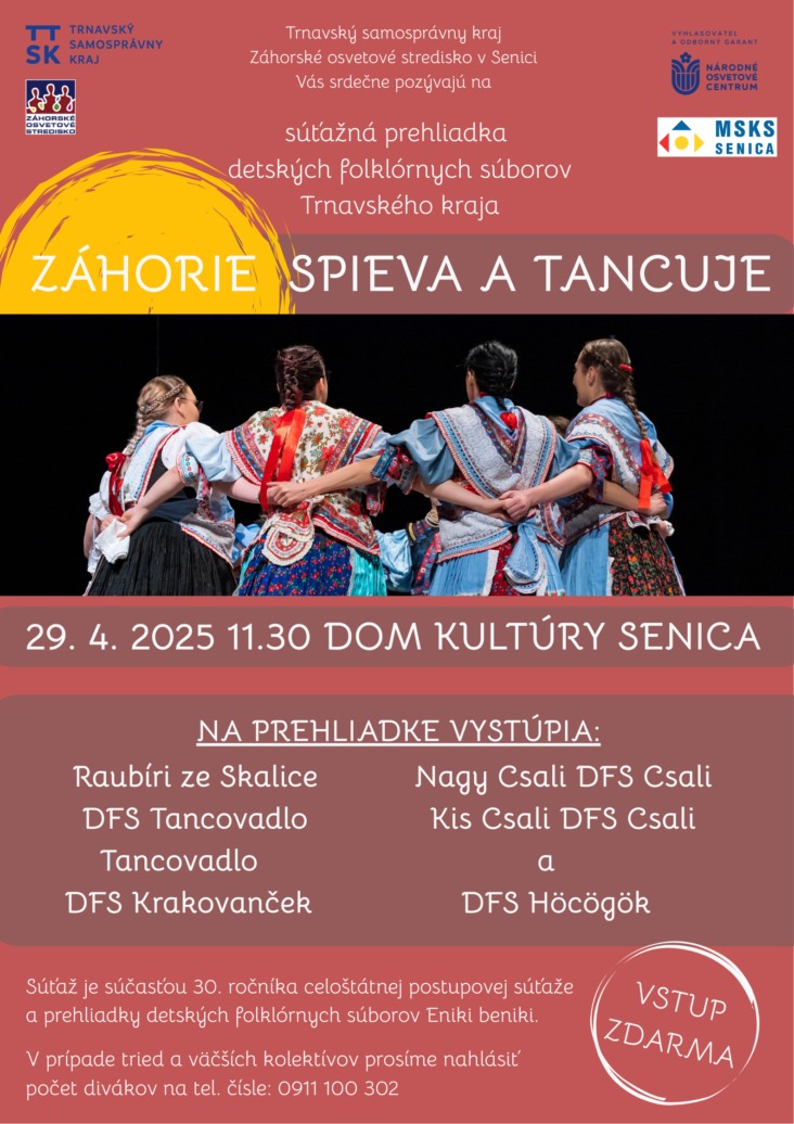 V utorok 29. apríla o 11.30 hod. vás srdečne pozývame do Kultúrneho domu v Senici na súťažnú prehliadku detských folklórnych súborov Záhorie spieva a tancuje. Deti chovajúce lásku k folklóru sa vám predstavia so svojimi hudobno-tanečnými vystúpeniami, s ktorými postúpili z regionálnych kôl do krajského kola súťaže. Záhorie spieva a tancuje je súčasťou celoštátnej súťažnej prehliadky detských folklórnych súborov Eniki beniki, ktorá v tomto roku oslavuje svoj jubilejný 30. ročník.