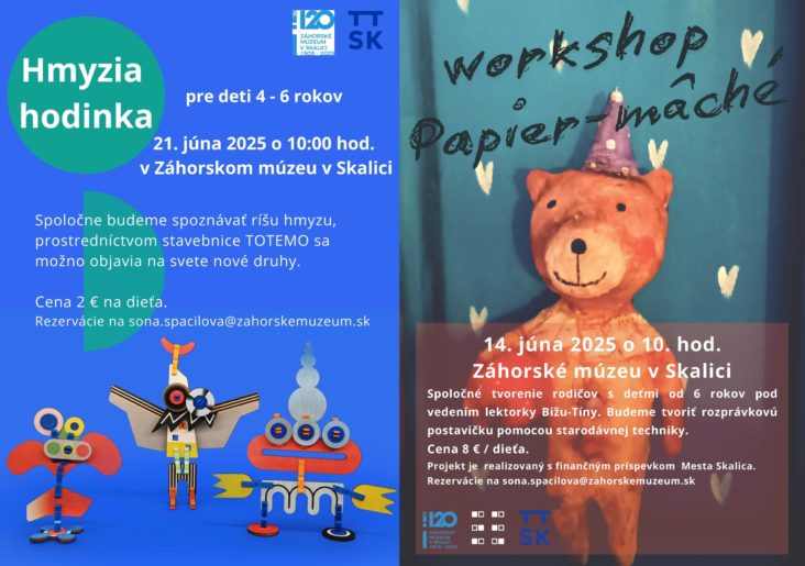 14. júna 2025 od 10.00 do 12.00 hod. sa bude konať Workshop papier-mâché, spoločné tvorenie rodičov s deťmi od 6 rokov pod vedením lektorky Bižu-Tíny. Vyskúšame si starodávnu remeselnú techniku, ktorá má korene už v starovekej Číne. Využite možnosť vyrobiť si rozprávkovú postavičku.