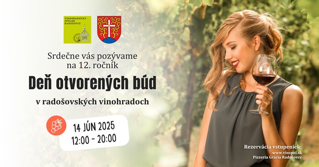 V sobotu 14.6.2025 v čase od 12.00 do 20.00 na Vás opäť čakajú miestni vinári vo svojich „búdach“. Príďte sa poprechádzať po krásnom prostredí našich vinohradov a ochutnať niektoré z originálnych miestnych vín. Akcie sa koná v krásnom prírodnom prostredí radošovských vinohradov.