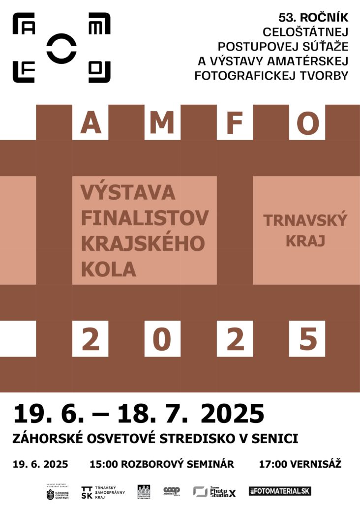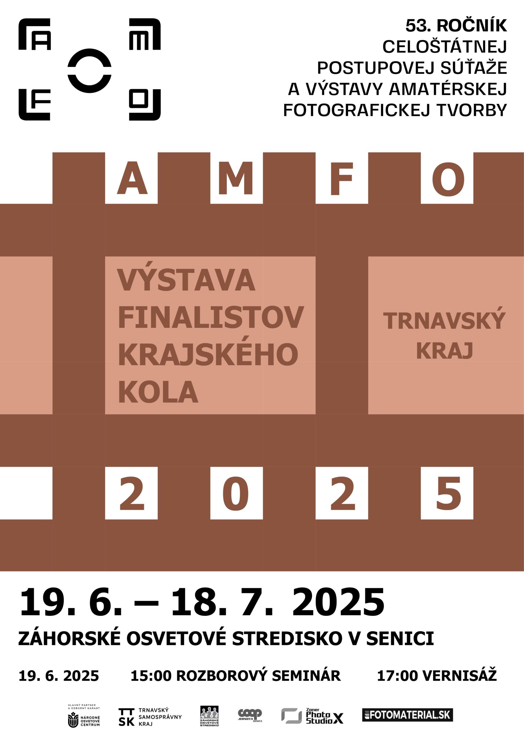 Trnavský samosprávny kraj – Záhorské osvetové stredisko v Senici je usporiadateľom 29. ročníka krajskej súťaže a výstavy neprofesionálnej fotografickej tvorby Trnavského kraja AMFO TTSK 2025. Súťaž je postupová – trojstupňová – ocenení a odporučení autori odbornou porotou z regionálnych kôl súťaže postúpili do krajského kola súťaže a následne do celoštátneho kola súťaže neprofesionálnej fotografickej tvorby – AMFO 2025.