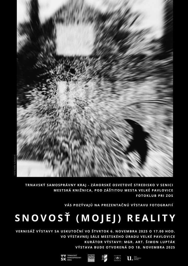 Trnavský samosprávny kraj – Záhorské osvetové stredisko v Senici, Mestská knižnica, pod záštitou Mesta Velké Pavlovice a Fotoklub pri ZOS Vás srdečne pozývajú na prezentačnú výstavu fotografií účastníkov fotografického workshopu STRETNUTIA SO ŠIMONOM LUPTÁKOM pod názvom SNOVOSŤ (MOJEJ) REALITY. Vernisáž výstavy sa uskutoční vo štvrtok 6. novembra 2025 o 17.00 hod vo výstavnej sále Mestského úradu Velké Pavlovice, ČR. Výstava bude otvorená od 6. novembra do 18. novembra 2025.