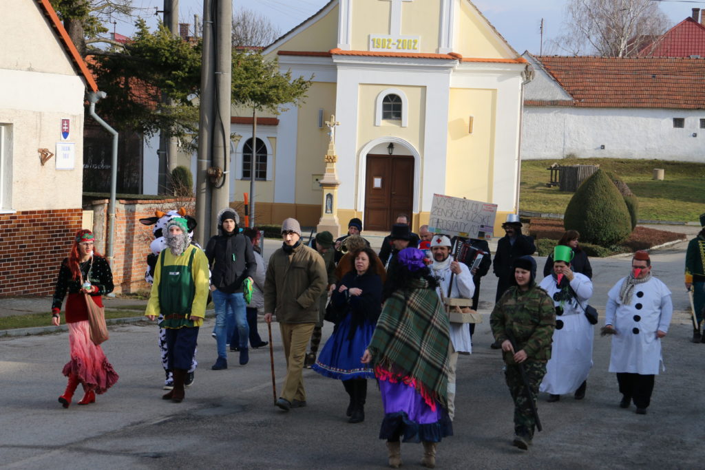 - Sprievod masiek a krojovaných účastníkov obcou.