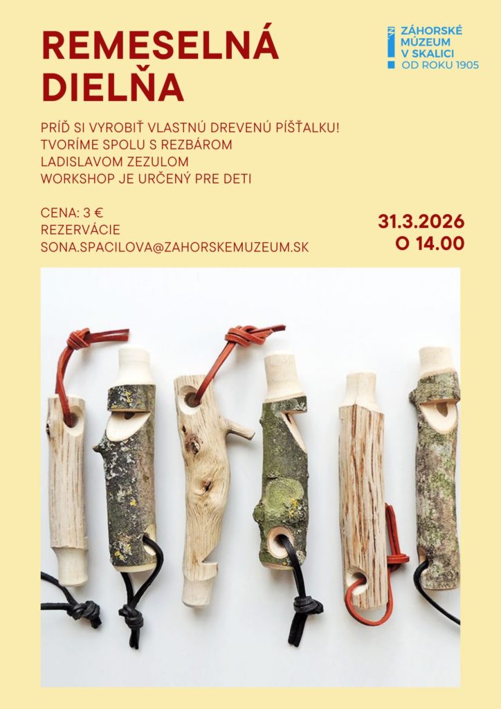 Workshop výroby drevených píšťaliek 31. marca 2026 o 14.00 hod.. Príď si k nám do múzea v utorok vyskúšať tradičné remeslo a objav čaro rezbárskej práce. Tvoríme s rezbárom Ladislavom Zezulom