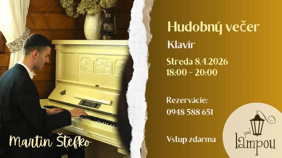 Hudobný večer s klaviristom Martinom Štefkom v Skalici sa uskutoční 8. apríla 2026 o 18:00 v kaviarni Pod lampou. Vstup je voľný a podujatie trvá približne dve hodiny.